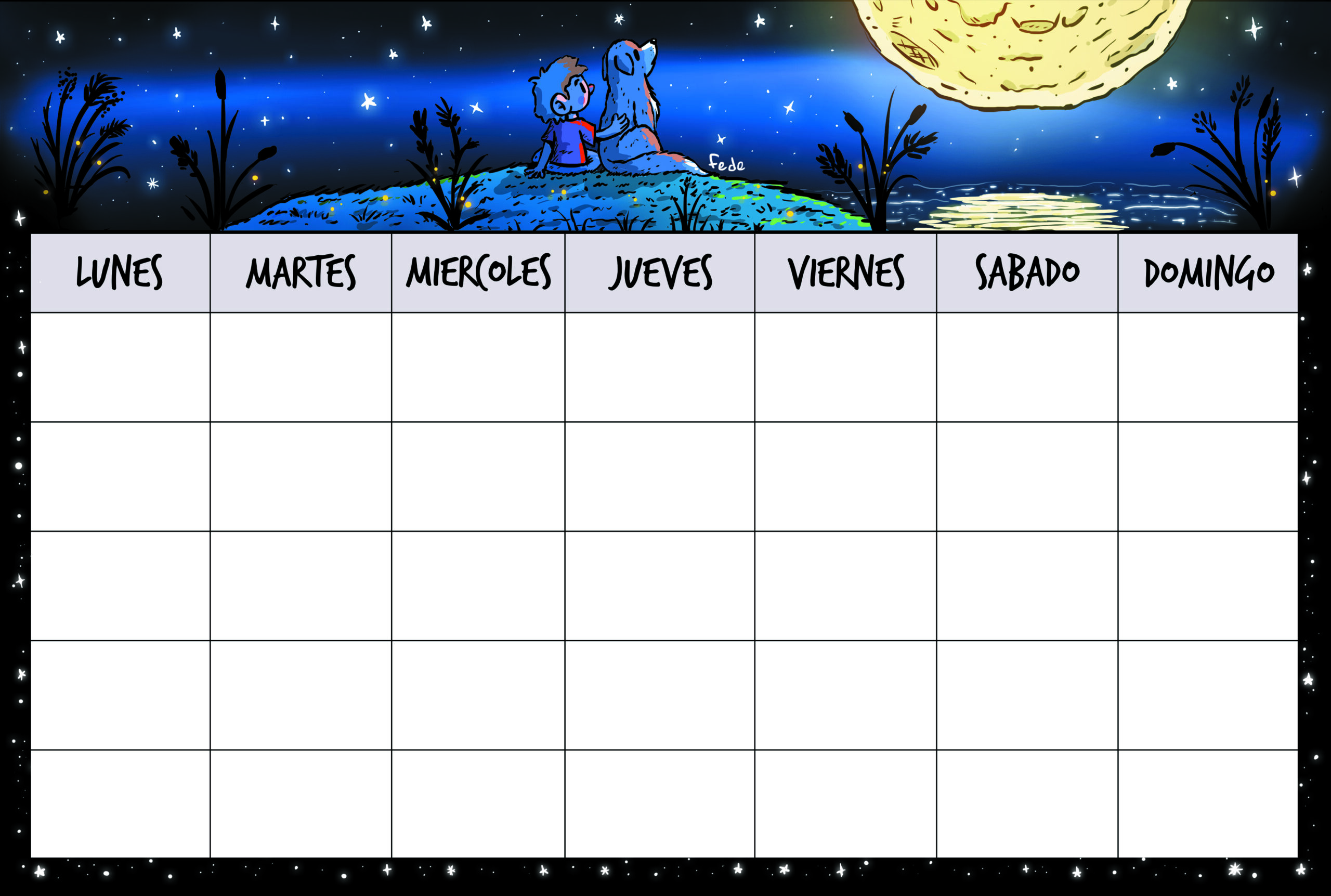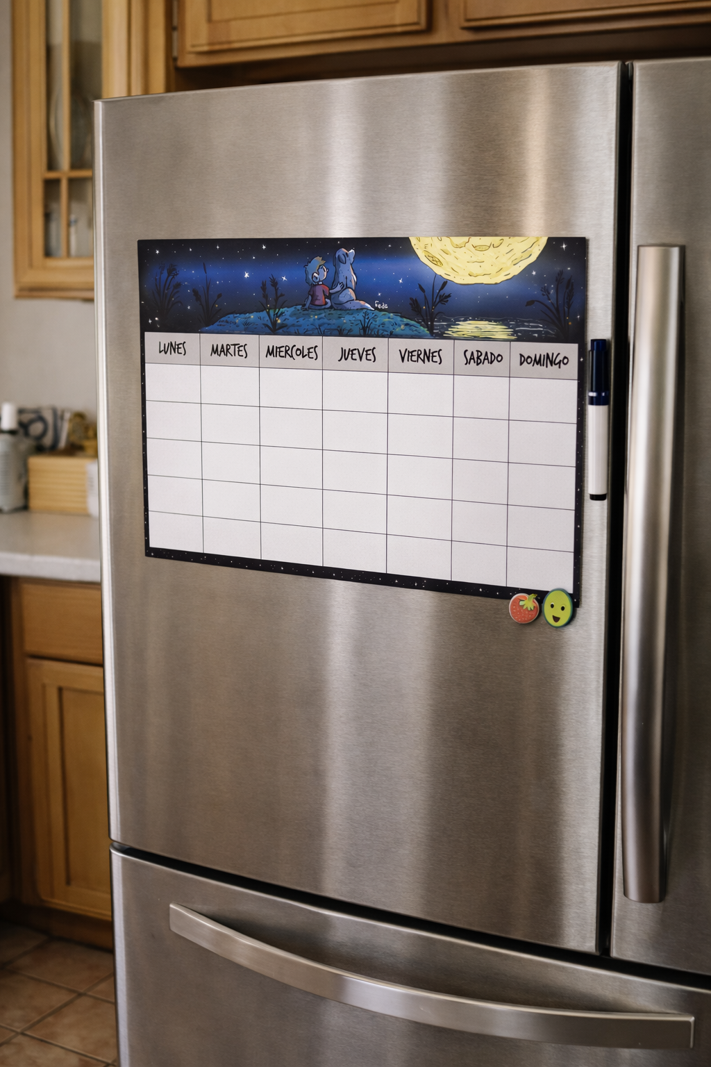 Planner mensual de 20×30 con ilustración, imantados y laminados para escribir con fibrón, borrar y reutilizar las veces que quieras. (Fibrón imantado incluido)